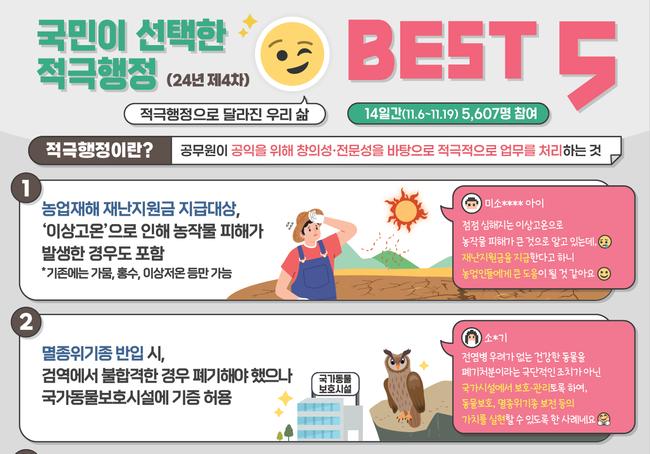 국무조정실은 국민이 선택한 제4차 적극행정 우수사례로 일상생활의 불편함을 해소한 5대 사례를 발표했다. 농업재해 대상 확대, 동물보호 강화 등 국민 체감도가 높은 정책이 선정됐다.