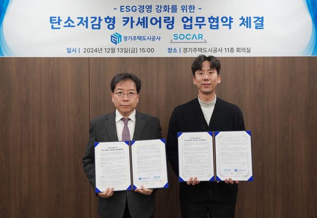 경기주택도시공사(GH)는 13일 수원 광교 사옥에서 국내 최대 자동차 공유 (카셰어링)플랫폼인 ㈜쏘카와 `탄소저감형 카셰어링` 업무협약을 체결했다고 밝혔다.