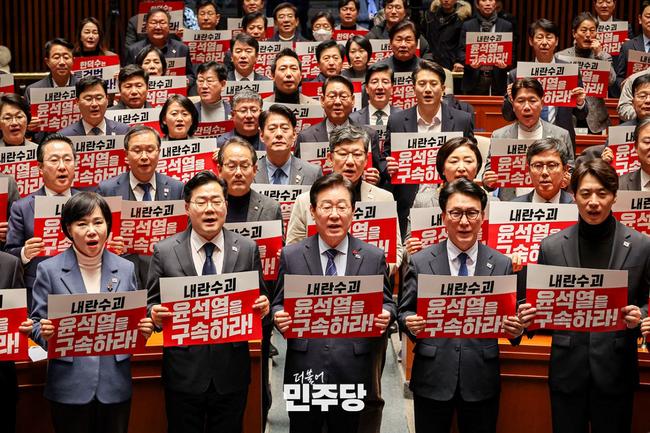이재명 당대표와 박찬대 원내대표가 2024.12.23.(월) 국회 본청 예결위회의장에서 열린 더불어민주당 의원총회에 참석하여 피켓을 들고 구호를 외치고 있다.