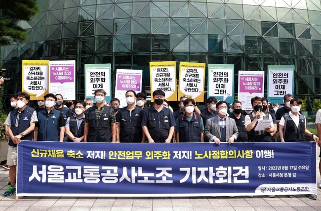 공공운수노조 서울교통공사노동조합은 17일 서울 중구 서울시청 앞에서 `신규채용 축소, 안전업무 외주화, 노사정 합의 해태 서울시 규탄` 기자회견을 진행했다.노조는 오세훈 서울시장의 ‘공공기관 경영혁신’ 방침으로 인해 신규인력 감축, 안전 업무의 자회사 이전이 예상된다고 주장하면서 이는 “노동조합만의 문제 아니라 청년 일자리, 나아가 시민 안전의 문제”라며 서울시에 관련 방침을 철회할 것을 요구했다.