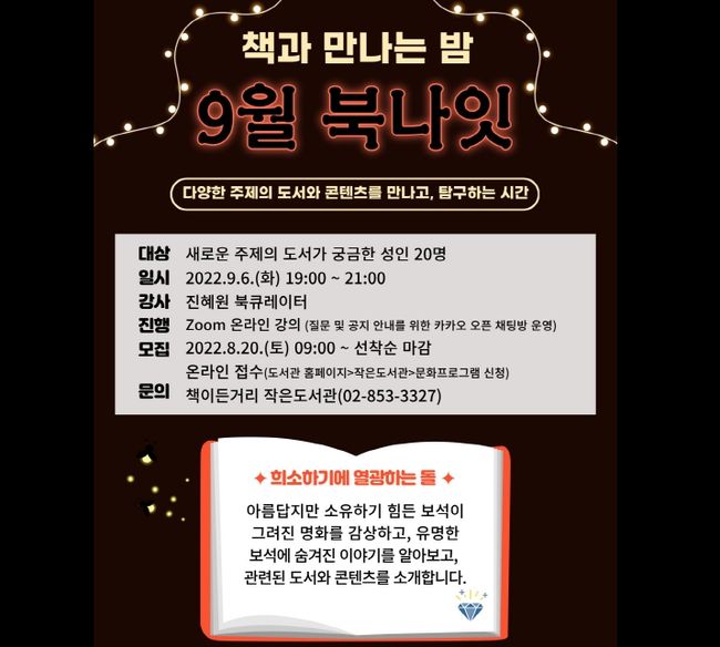 9월의 주제는 ‘희소하기에 열광하는 돌’로 아름답지만 소유하기 힘든 보석에 대해 이야기를 나눈다. 진혜원 북큐레이터와 함께 보석이 그려진 명화 속 숨겨진 이야기와 의미를 찾고 주제와 관련된 도서, 명화, 영화, 드라마도 탐색해본다.