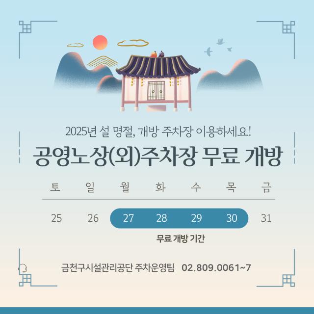 서울특별시 금천구시설관리공단은 설 연휴 관내 구민과 귀성객 편의를 위해 오는 1월 27일(월)부터 30일(목)까지 4일간 공영노상(외)주차장을 무료로 개방한다고 밝혔다.
