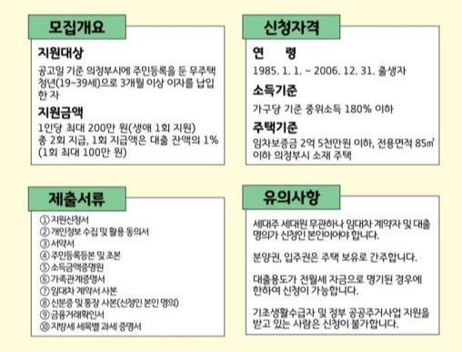 의정부시(시장 김동근)는 청년들의 주거비 부담을 줄이고 안정적인 주거환경을 조성하기 위해 `청년 전·월세 보증금 대출이자 한시 지원사업`의 신청자를 3월 4일부터 31일까지 모집한다.