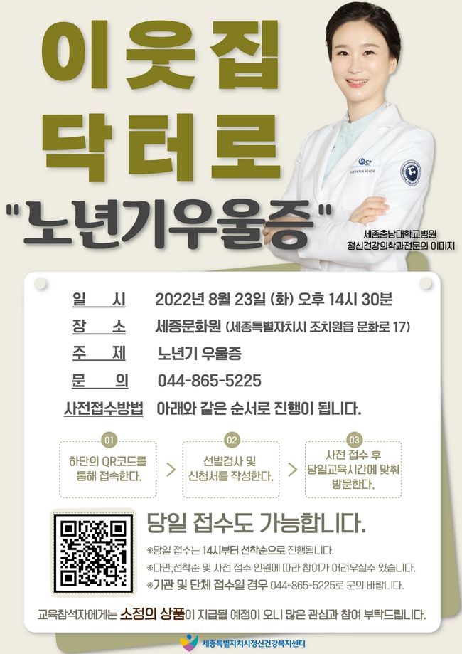 초청 강사는 세종충남대학교병원 정신건강학과 전문의 이미지교수가 강사로 나서 ‘노년기 우울증’을 주제로 진행할 예정이다.