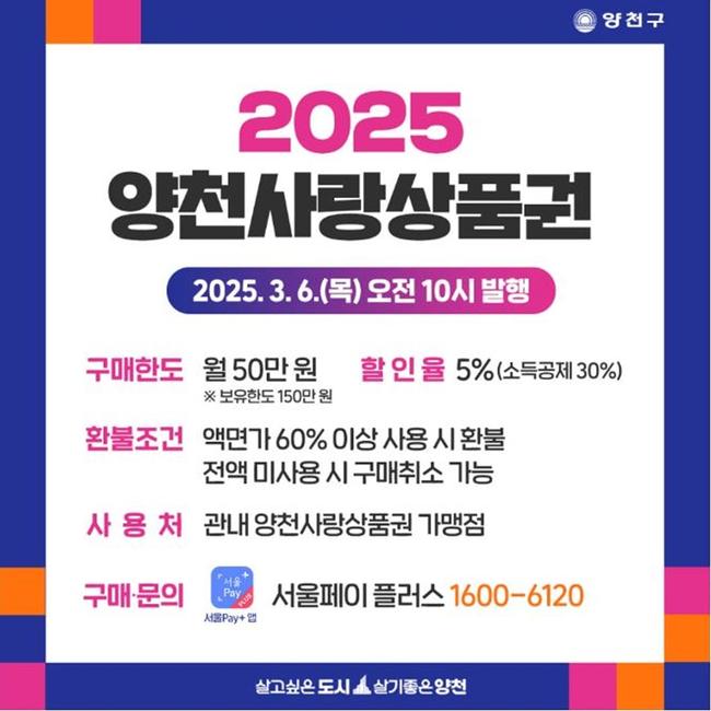 양천사랑상품권은 `서울페이플러스`(서울Pay+) 앱에서 5% 할인된 금액에 구매할 수 있다. 1인당 월 50만 원까지 구매할 수 있고 최대 보유 한도는 150만 원이다. 구매일로부터 5년 이내 사용할 수 있고, 상품권 금액의 60% 이상 사용했다면 잔액을 환불받을 수 있다.