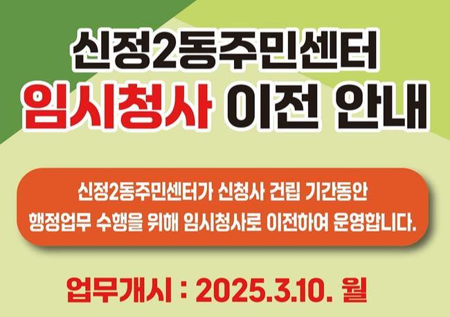 양천구(구청장 이기재)는 지은 지 30년이 넘은 동 청사의 재건축을 추진하고 있는 가운데, 첫 주자인 `신정2동 주민센터`가 착공에 들어감에 따라 3월 10일(월)부터 임시청사(신정동 118-30)로 옮겨 업무를 개시한다고 6일 밝혔다.