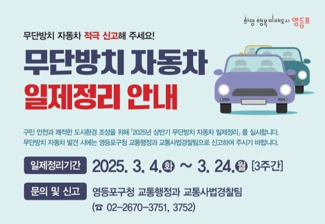 최호권 영등포구청장은 “무단방치 자동차는 도시 미관을 해치고 교통 흐름을 방해하는 요인”이라며 “구민 여러분의 적극적인 신고와 협조를 부탁드린다”라고 전했다.