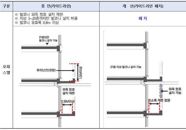 이에 따라 서울시는 지난 2월 25일 ‘규제철폐 42호’의 후속 조치로 `서울시 오피스텔 발코니 설치기준`을 폐지했다. 이번 조치로 발코니 외측에 창호 설치가 가능해졌으며, 기존의 발코니 설치 허용 범위(지상 3층~20층)와 유효폭 0.8m 이상 등의 기준도 사라졌다.