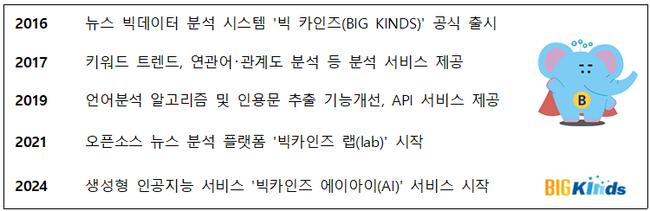 ‘빅카인즈’는 2016년부터 운영된 뉴스 빅데이터 분석 플랫폼으로, 종합일간지부터 지역지, 방송사까지 1억 건 이상의 뉴스를 수집·분석해 왔다. 누구나 회원 가입을 통해 뉴스 검색, 인물·기관 관계도, 연관어 분석 등 서비스를 무료로 이용할 수 있으며, 연구와 교육, 공공 서비스 개선 등에 활발히 활용되고 있다.