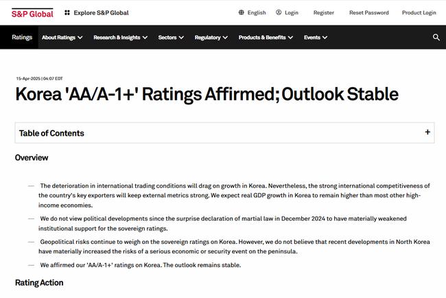 특히 정치 상황과 관련해 S&P는 “예상치 못한 비상계엄 선포로 정치적 안정성에 대한 신뢰가 일시적으로 손상되었으나, 신속한 철회와 적절한 대응 덕분에 악영향이 완화됐다”고 평가했다. 또한 대통령 선거 일정이 관련 법령과 절차에 따라 원만히 진행되고 있다는 점도 사회·경제적 안정성을 유지하는 요인으로 꼽았다.