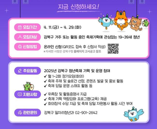 서울 강북구(구청장 이순희)는 오는 가을 개최 예정인 제2회 강북구 청년축제에 참여할 축제 기획단원을 이달 29일(화)까지 공개 모집한다고 밝혔다.