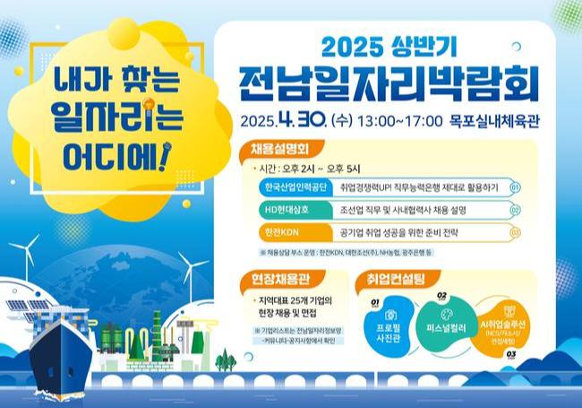 전라남도는 오는 30일 목포실내체육관에서 `2025 상반기 전남일자리박람회`를 개최한다. 조선업·식품 제조업·관광숙박 등 다양한 분야 28개 기업에서 148명 채용을 목표로 하고 있다.