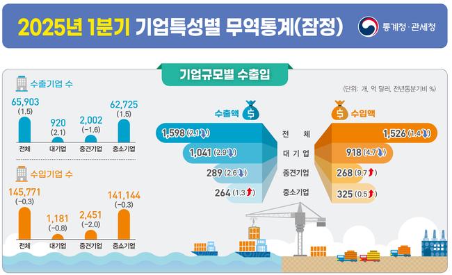 2025년 1분기 기업특성별 무역통계 잠정치에 따르면, 전체 수출은 전년 동분기 대비 2.1% 감소했고, 수입은 1.4% 줄어든 것으로 나타났다.