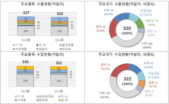 관세청이 5월 21일 발표한 `2025년 5월 1일~20일 수출입 현황`에 따르면, 해당 기간 수출은 전년 동기 대비 2.4% 감소한 320억 달러, 수입은 2.5% 줄어든 322억 달러로 나타났다.