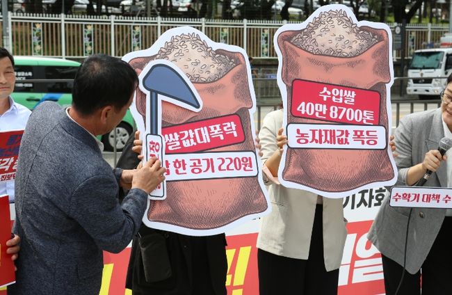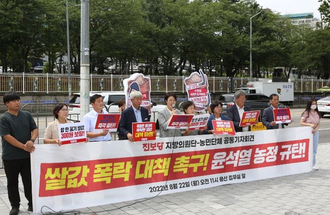 진보당 지방의원단과 전국농민총연맹 소속 농민들은 22일 서울 용산구 대통령실 앞에서 윤석열 정부의 농정을 규탄하는 기자회견을 가졌다. 이들은 기자회견을 통해 “쌀값 대폭락(밥 한공기 쌀값 224원), 농자재 값과 인건비 폭등, 농가 부채 이자율 폭등 등으로 농민들의 생존권이 위협받고 있다”고 주장했다.