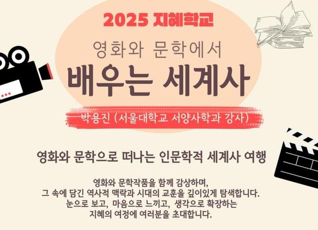 강연은 서울대학교 역사학부 박용진 강사를 초빙해 `영화와 문학에서 배우는 세계사`를 주제로 진행된다.
