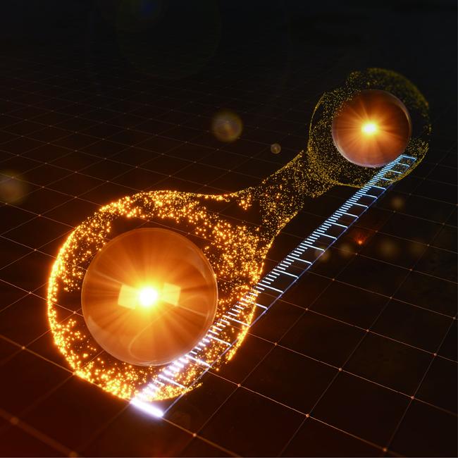 <양자거리 측정 개념도> 두 개의 노란 공은 전자를 나타내며, 그 아래 흰색 눈금은 거리를 측정한다는 의미로 `자`를 표현한 것이다. 전자 간의 유사성을 의미하는 양자 거리는 실제 거리와 약간 다른 개념이지만 `양자거리 측정`을 직관적으로 표현하기 위한 그림이다. 그림설명 및 그림제공 : 연세대학교 김근수 교수