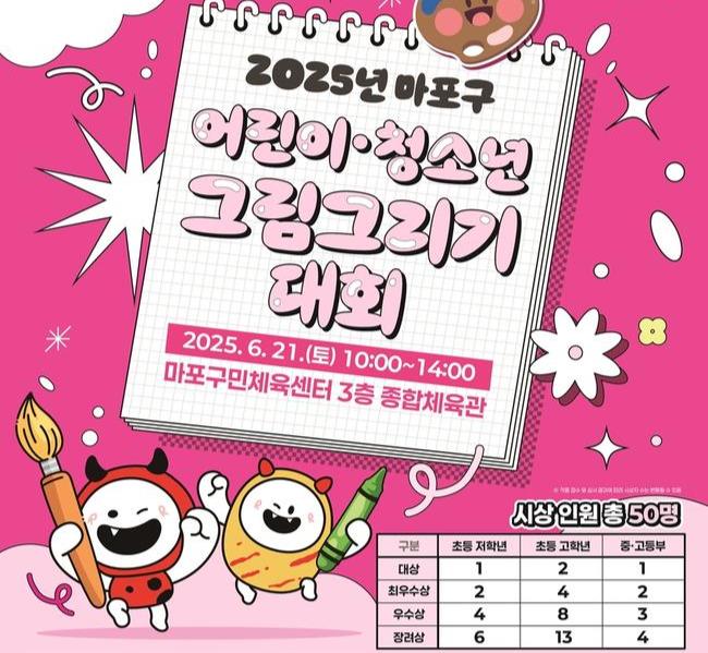 `마포구 어린이·청소년 그림 그리기` 대회는 6월 21일 오전 10시부터 오후 2시까지 마포구민체육센터 3층 종합체육관에서 열린다. 그림 주제는 공정한 대회 진행을 위해 현장에서 당일 공개된다.