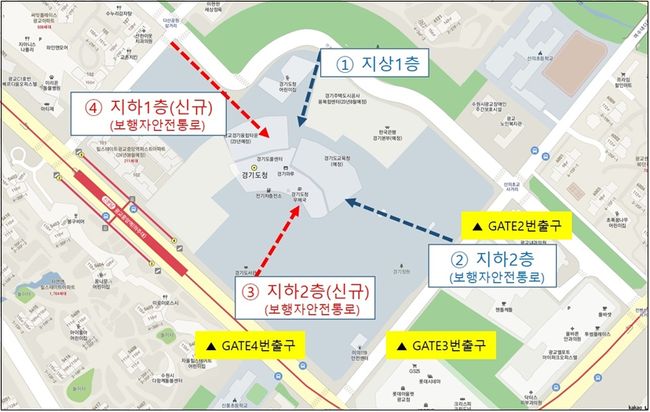 23일 경기도에 따르면 도는 도청사를 방문하는 방문객들의 불편을 줄이라는 김동연 경기도지사의 지시에 따라 서쪽 지하 1층 보행자 출입구, 북측 광교중앙역 4번 출구 방향의 보행자 안전 통로 등을 확보해 오는 30일 개통할 예정이다. 기존에는 북측, 동측 출입구 2곳만 운영했다.