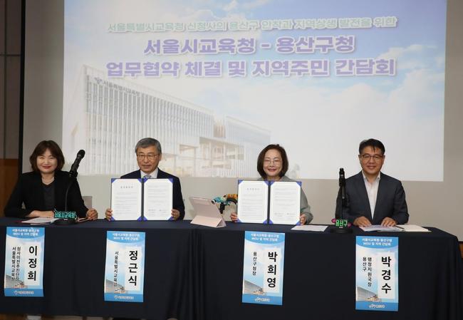 서울 용산구(구청장 박희영)가 지난 1일 서울시교육청(교육감 정근식)과 `지역공동발전 및 교육협력강화`를 위한 업무협약(MOU)을 체결했다. 협약식은 서울시교육청 신청사 부지 인근 갈월종합사회복지관(두텁바위로 25)에서 주민 100여 명이 참석한 가운데 열렸다.