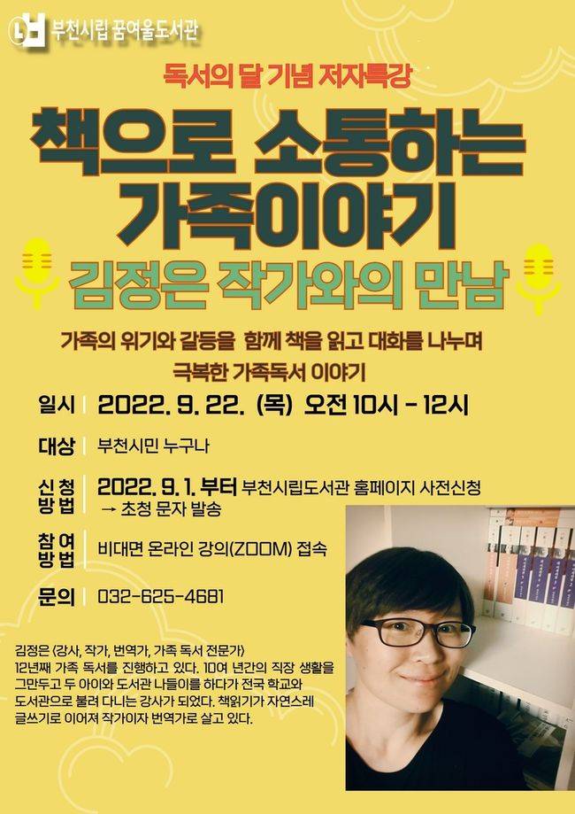 부천시립꿈여울도서관은 독서의 달을 맞이하여 <책으로 소통하는 가족이야기> 김정은 작가와의 만남을 오는 9월 22일 목요일 오전 10시부터 온라인으로 운영한다.