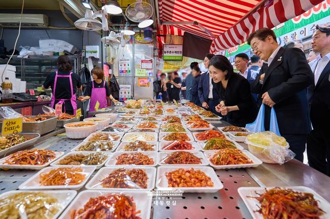 이재명 대통령과 김혜경 여사가 6일 서울 사당동 남성시장을 방문해 상인들과 대화하고 있다.