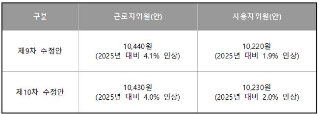 근로자위원은 제9차 수정안에서 10,440원(2025년 대비 4.1% 인상)을 제시했으나, 제10차 수정안에서는 10,430원(2025년 대비 4.0% 인상)으로 소폭 하향 조정했다. 반면 사용자위원은 제9차 수정안에서 10,220원(2025년 대비 1.9% 인상)을 제시했다가, 제10차 수정안에서는 10,230원(2025년 대비 2.0% 인상)으로 10원 상향 조정했다.