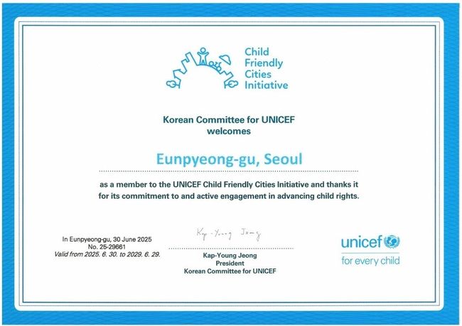 서울 은평구가 지난 6월 30일 유니세프 한국위원회로부터 아동친화도시 상위단계 인증을 획득하며 아동 권리 증진을 위한 노력을 다시 한번 인정받았다. 이번 인증으로 은평구는 2025년 6월 30일부터 2029년 6월 29일까지 4년간 유니세프의 전문적인 지원과 자문을 받게 된다.