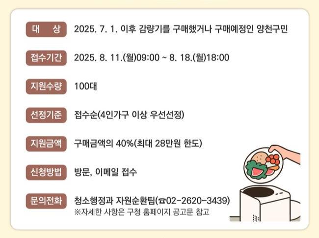 이기재 양천구청장은 "이번 지원을 통해 가정 내 음식물쓰레기를 효과적으로 줄이고, 환경 보호와 주민 생활 편의 증진에도 크게 기여할 것으로 기대한다"며 "앞으로도 구민과 함께하는 실효성 높은 자원순환 정책을 지속적으로 발굴·추진해 나가겠다"고 밝혔다.