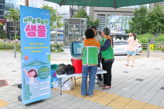이번 사업은 구가 지난 6월 현장실사와 자율방재단 간담회를 거쳐 유동인구가 많은 양재역, 예술의전당, 이수역, 서래골공원, 양재천 수변무대 등 5곳이 운영 장소로 선정됐다. 이곳 5곳에는 각 장소별로 하루 600병씩 하루 총 3,000병의 생수가 제공된다. 특히 구는 지역 내 슈퍼마켓과 협약을 통해 생수를 구매해 지역경제 활성화에도 힘을 보탠다는 계획이다.