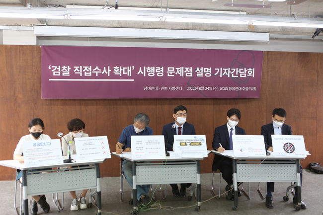 참여연대 · 민주사회를위한변호사모임 사법센터 등은 24일 서울 종로구 참여연대 아름드리홀에서 `검찰 직접수사 확대` 시행령 문제점 설명 기자간담회를 가졌다. 이어 “9월 시행될 개정 검찰청법에서는 축소한 검사의 수사개시 범위를 시행령으로 재확대하는 건 모법 취지를 무력화하는 것”이라고 비판했다.