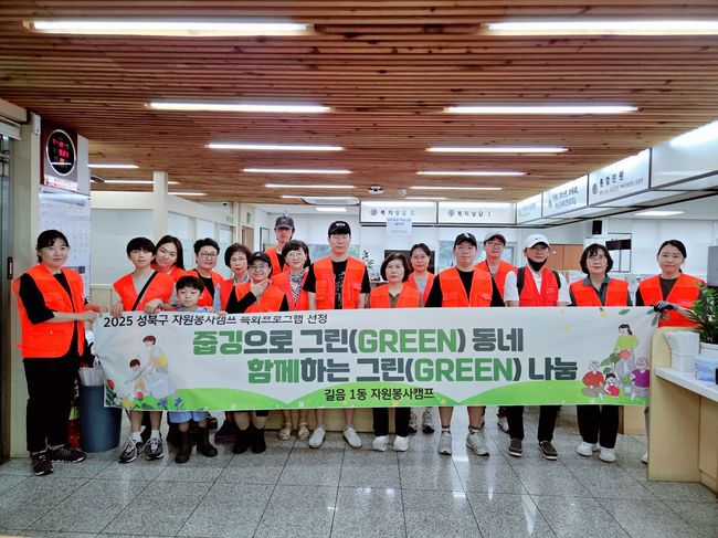 성북구 길음1동, 자원봉사자들과 ‘줍깅’…세대 아우른 환경정비 나서 - ‘그린 동네, 그린 나눔’ 캠페인 일환…자원봉사캠프 특화사업 - 어린이부터 어르신까지 다세대 참여…주민 호응 높아 - 정재환 동장 “일상 속 참여형 봉사 지속 발굴할 것”