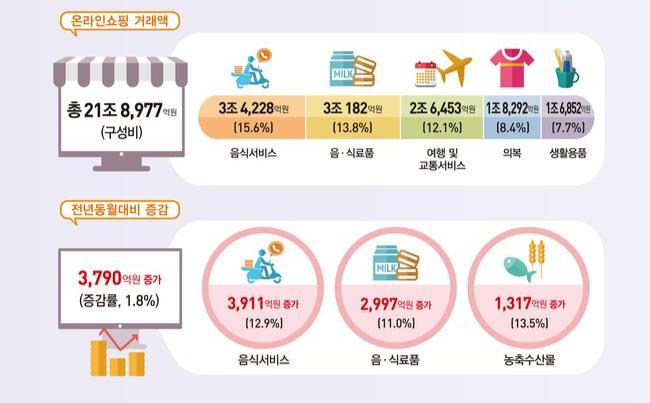 특히 모바일 쇼핑의 성장이 두드러졌다. 모바일 쇼핑 거래액은 17조 339억 원으로 전년 동월 대비 7,530억 원(4.6%) 늘었다. 이에 따라 전체 온라인쇼핑 거래액 중 모바일이 차지하는 비중은 77.8%로 전년 동월 대비 2.1%포인트 상승했다. 모바일 거래액 비중이 높은 상품군은 음식 서비스(99.1%), 이쿠폰 서비스(89.6%), 아동·유아용품(83.6%) 순이었다.