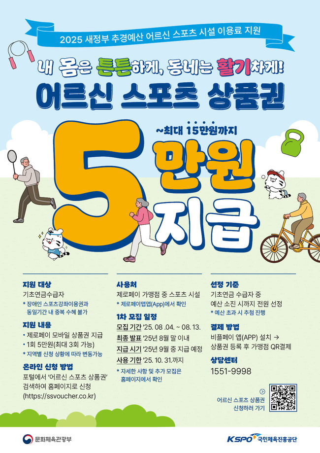 지원 신청은 8월 4일부터 13일까지 진행되며, 전용 누리집(www.ssvoucher.co.kr)을 통해 온라인으로 접수 가능하다. 신청을 완료한 대상자에게는 문자로 상품권 사용 PIN 번호가 안내되며, 이를 모바일 앱 ‘비플레이(BePLAY)’에 등록해 전국 제로페이 가맹 스포츠시설에서 사용할 수 있다. 지급은 9월 중 이뤄지며, 사용 기한은 10월 31일까지다.