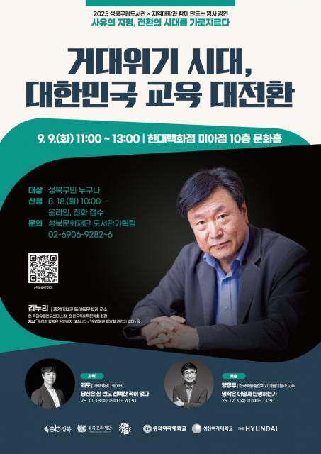 성북문화재단은 이번 강연이 다양한 사회문제에 대한 깊이 있는 성찰을 통해 한국 교육이 나아갈 방향을 모색하는 의미 있는 시간이 될 것이라고 밝혔다.