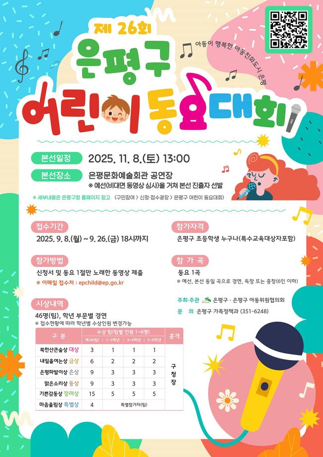 은평구(구청장 김미경)는 관내 초등학생이라면 누구나 참여할 수 있는 ‘제26회 은평구 어린이 동요대회’를 연다고 밝혔다. 대회는 은평구 아동위원협의회가 주관해 온 전통 있는 행사로, 어린이들에게 꿈과 열정을 표현할 기회를 제공하고 미래 인재로 성장하는 발판을 마련하기 위해 진행돼 왔다.