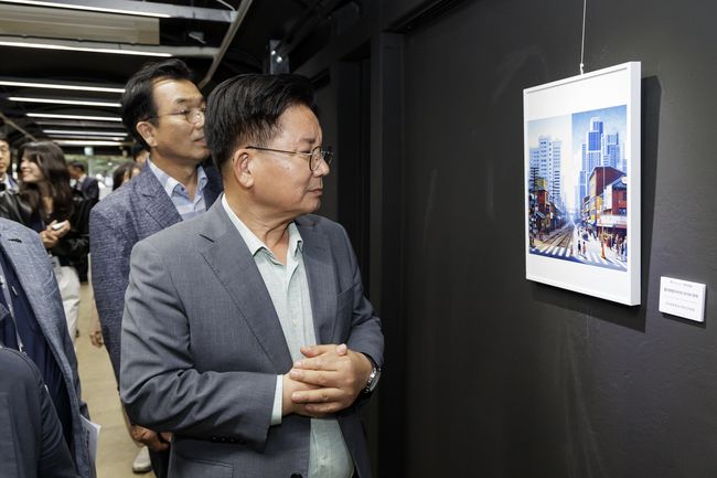 박강수 마포구청장이 레드로드 발전소 갤러리에 전시된 작품을 감상하고 있다.
