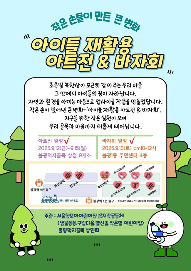 행사 기간 동안 불광먹자골목 내 9개 상점에서는 아이들이 직접 만든 재활용 아트 작품이 전시된다. 또 불광1동 주민센터 4층 강당에서는 13일 오전 10시부터 정오까지 바자회가 열린다.