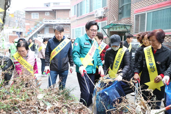 지난 3월, 박일하 동작구청장이 서울 동작구 노량진1동에서 주민들과 상습 무단투기 지역 및 이면도로를 청소하고 있다.