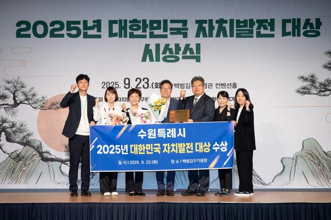 수원특례시(시장 이재준)가 (사)한국자치발전연구원 주관 `2025년 대한민국 자치발전대상`에서 기초자치 부문 대상을 받았다. 시상식은 23일 백범김구기념관 컨벤션홀에서 열렸다.