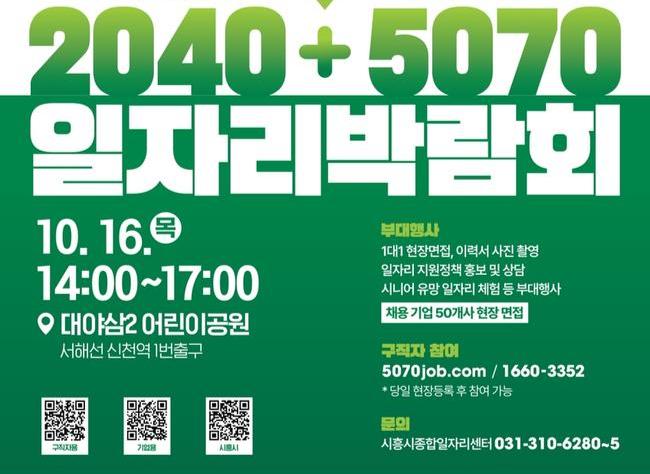 시흥시(시장 임병택)는 경기도 및 경기도일자리재단과 함께 `2025년 K-시흥 2040 플러스 경기도 5070 일자리박람회`를 오는 10월 16일 오후 2시부터 5시까지 대야삼2어린이공원(서해선 신천역 1번 출구 앞)에서 개최한다.