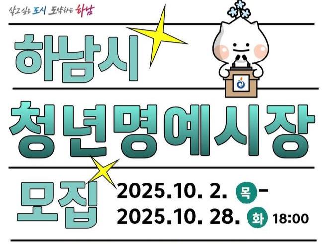 청년명예시장 모집에 대한 자세한 내용과 관련 서류 등은 하남시청 홈페이지 고시공고란에서 확인할 수 있으며, 신청은 청년일자리과 청년지원팀(본관 3층)에 방문하거나 이메일(wlwl3242@korea.kr)로 신청서와 구비서류를 제출하면 된다. 접수 마감은 10월 28일(화) 18시까지다.