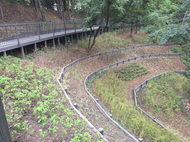 온수근린공원 문학지구에 조성된 `연결 숲길`의 데크로드와 데크로드 아래 사면안정을 위해 식재된 관목 등의 모습.이번 ‘연결 숲길 조성사업’은 지난 15일 완료됐으며, 온수근린공원 문학지구 상부와 하부 주거지역을 안전하게 잇는 보행로를 확보하기 위해 추진됐다.