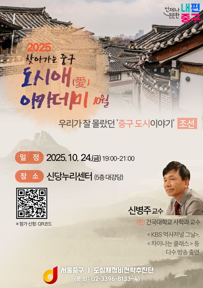 지난 8월 개설된 ‘중구 도시애(愛) 아카데미’는 주민이 참여하는 도시 인문 교양 프로그램으로, 기존의 정비사업 중심 아카데미에서 벗어나 ‘사람 중심의 도시 이해’를 목표로 기획됐다. 앞서 건축가 유현준 교수의 ‘공간으로 읽는 대한민국’, 김인희 박사의 ‘도시비전 콘서트’ 강연이 성황리에 열리며 주민들의 큰 호응을 얻었다.