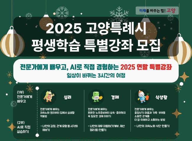 고양특례시(시장 이동환)는 지난 상반기부터 진행된 평생학습 시민강좌가 시민들의 큰 호응을 얻은 데 힘입어 12월 1일 2025년을 마무리할 특별강좌를 운영한다고 밝혔다.