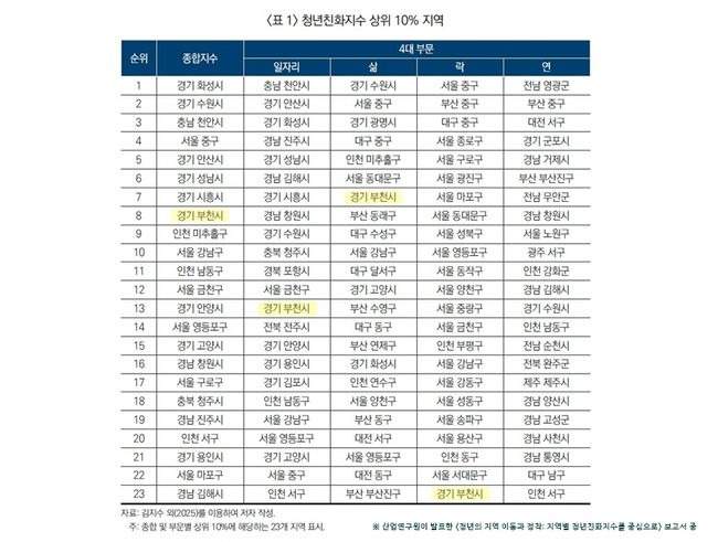 산업연구원의 `청년의 지역 이동과 정착` 보고서 중 표1 청년친화지수 상위 10% 지역.산업연구원은 최근 `청년의 지역 이동과 정착: 지역별 청년친화지수를 중심으로` 보고서를 통해 전국 229개 시·군·구의 청년 정주 여건을 일자리(Work)·삶(Life)·락(Fun)·연(Engagement) 4개 부문으로 나눠 분석한 결과를 23일 내놨다. 부천시는 종합지수 전국 8위, 경기도 내 6위로 상위 10%에 진입했으며, 4개 부문 중 3개에서 상위 10% 안에 들었다.