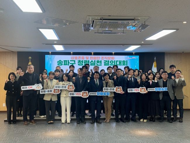 송파구 청렴실천 결의대회.송파구는 전 부서가 참여하는 `2026년도 종합청렴도 향상 추진계획`을 수립했다고 25일 밝혔다. ▲부패예방 체계 강화 ▲소통 중심 조직문화 조성 ▲전 직원 청렴 실천 ▲구민 참여·협력 강화 등 4대 전략을 축으로 한다.