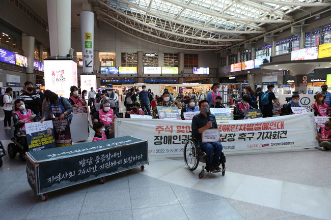 ‘전국장애인차별철폐연대(전장연)’는 8일 오전 서울 용산역에서 기자회견을 열고 우리나라 장애인 관련 예산이 OECD(경제협력개발기구) 평균인 1.6%에 한참 못 미치는 0.3%에 불과하다고 주장했다.