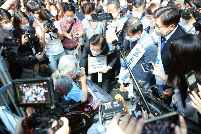 추석 귀성객 인사를 나온 이재명 민주당 대표는 박경석 전장연 대표를 만나 이들의 애로사항을 청취하고 `장애인도 함께 사는 세상을 만들겠다`고 말했다. 용산 역사 내에서 전장연이 시위를 진행 중인 가운데 추석 귀성객 인사를 나온 이재명 민주당 대표는 박경석 전장연 대표를 만나 이들의 애로사항을 청취하고 “장애인도 함께 사는 세상을 만들겠다”고 말했다.
