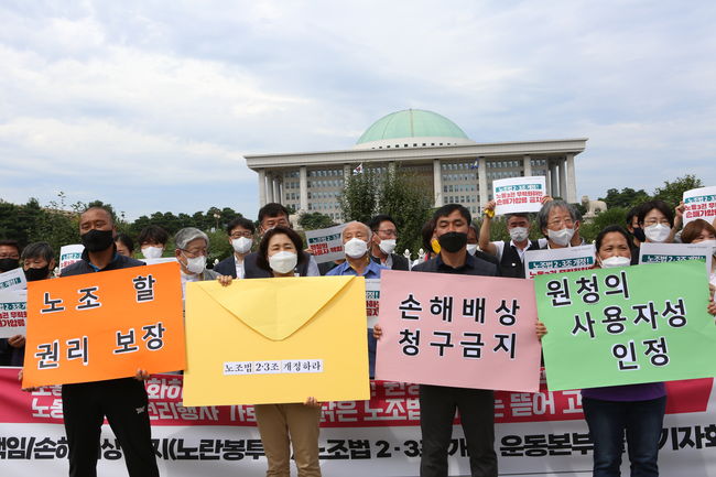 민주노총과 전국민중행동, 비정규직이제그만공동투쟁 등 노동시민사회단체 관계자들은 14일 서울 여의도 국회 앞에서 `노조법 2 · 3조 개정 운동본부` 출범 기자회견을 가졌다.기자회견 참가자들은 ‘노조할 권리 보장’ ‘원청의 사용사성 인정’ ‘손해배상 금지’ 등의 구호를 외치며 노란 봉투를 들고 퍼포먼스를 벌이기도 했다.